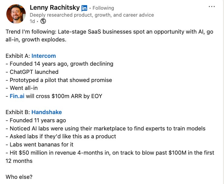 If AI is reshaping tours, it’s also reshaping business models. Lenny Rachitsky points out a new pattern: late-stage SaaS companies are reigniting growth by going all-in on AI. Startups may be early adopters of AI, but mature companies are showing that it can serve as a second act. The next curve often comes from embedding AI into areas where growth has slowed.