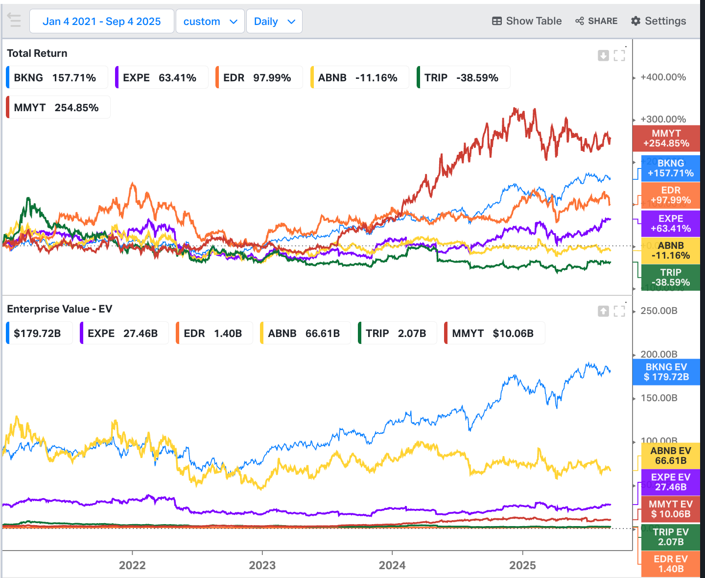 Since January 2021, Booking has seen a 158% increase and is now valued at almost $180 billion in enterprise value. MakeMyTrip has been the breakout, up 255% as India’s market surged. eDreams has nearly doubled, Expedia is up 63%, while Tripadvisor has slid 39%. Airbnb is the outlier: still worth $67B, but its stock is down 11%. Investors are rewarding focus and predictable margins. Booking keeps selling hotels and flights at scale, MakeMyTrip has locked in on India, and both have been rewarded. Airbnb’s lifestyle pivots haven’t convinced Wall Street. TripAdvisor and eDreams trade at a fraction of the scale, reminding us how concentrated global travel has become.