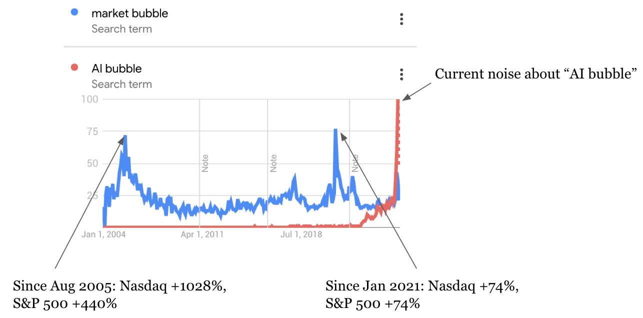 Since 2005, when “market bubble” searches spiked, the Nasdaq is up more than 10x. Since 2021, it’s up over 70%.