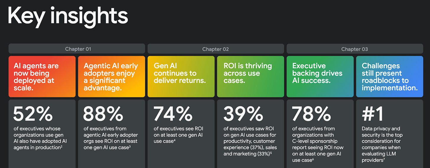 Google Cloud published its second annual ROI of AI report, based on a survey of 3,400+ senior leaders. A few highlights: