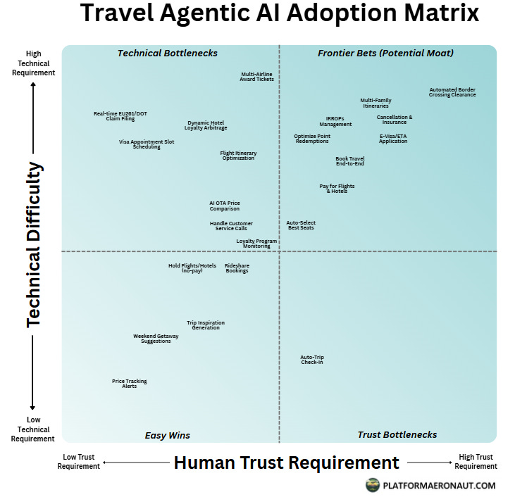 Simple and low-stakes tasks like trip inspiration or price alerts are easy wins. High-stakes, high-friction jobs, such as end-to-end booking, multi-family itineraries, or border clearance, sit in the “frontier bets” quadrant. Adoption will roll out unevenly; the quick wins will hit first, but the real moats get built in the messy, complex jobs travelers care about most. Read + Thomas Reiner