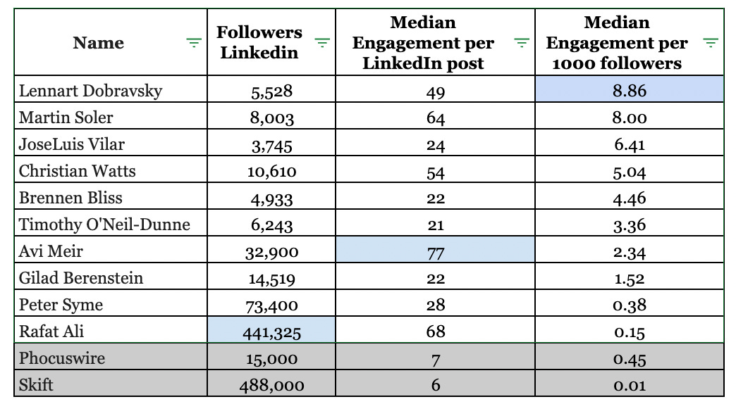 I analyzed LinkedIn engagement for the individuals who were mentioned 3+ times in the survey, along with two benchmarks: Phocuswire and Skift, two leading travel media brands.