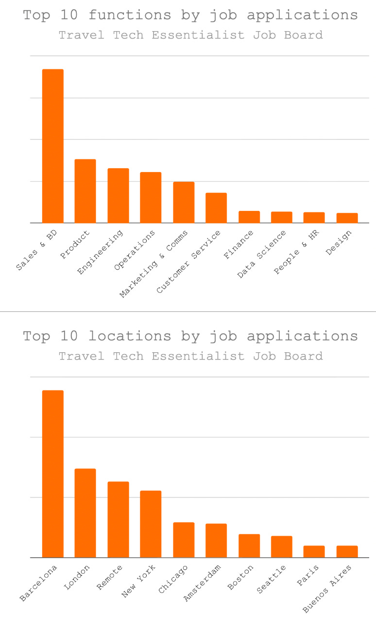 Here’s a look at the top 10 job functions and locations from applications on the Travel Tech Essentialist Job Board over the past two months.